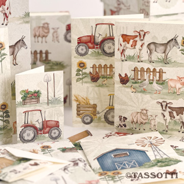Unter den für die Kleinsten bestimmten Mustern sticht "Fattoria" (Bauernhof) hervor, wo alle Elemente des bäuerlichen Lebens mit Fülle und kreativer Sensibilität Platz finden: Tiere, Arbeitsgeräte, Traktoren und Scheunen, in einem authentischen und glücklichen Porträt, das nach Echtheit riecht, perfekt, um Gedanken an Kinder zu richten oder Momente der Zärtlichkeit zu besiegeln.