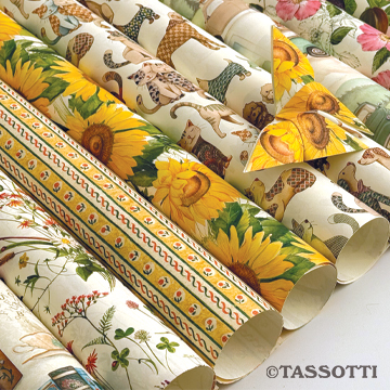 Für eine leichtere und erzählerischere Bildwelt greift das Dekorpapier Holiday das Thema Reise und Urlaub anhand ikonischer Motive wie Autos mit Gepäck neu auf. Das Angebot wird zudem durch das Muster Cani e Gatti (Hunde und Katzen) bereichert, in dem die beliebtesten Haustiere mit leichter und ironischer Handschrift dargestellt und mit Dekorationen inspiriert von den historischen Motiven der Druckerei “gekleidet” werden, begleitet von einer koordinierten Auswahl an Grußkarten. Die Grußkarten von Tassotti sind dazu gedacht, jeden Anlass zu begleiten, und in diesem Jahr wurde den Themen Geburt und Hochzeit besondere Aufmerksamkeit gewidmet, mit Motiven aus Künstleraquarellen, ergänzt und bereichert durch klassische Remondini-Muster.