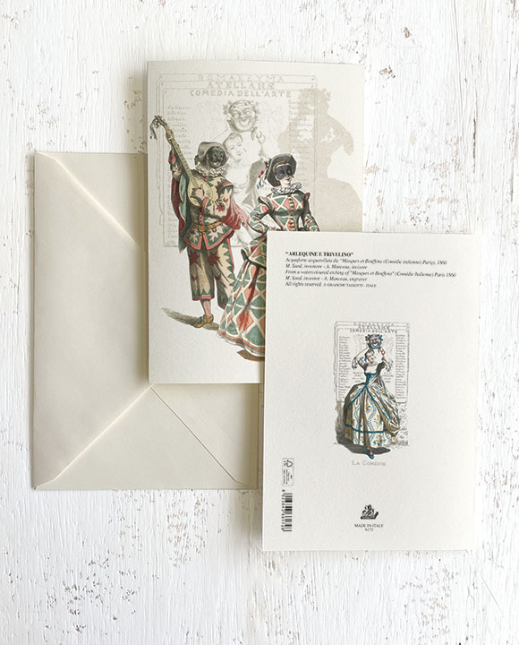 Maschere tipiche della Commedia dell'Arte tratte da acqueforti acquerellate della seconda metà dell'Ottocento francese: Arlecchino, il servo scaltro e astuto; Colombina l'innamorata; Pulcinella buffone e sfortunato; Pantalone il vecchio avaro e altri personaggi ancora.