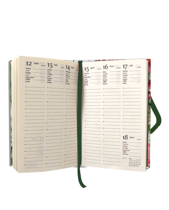 Agende settimanali e giornaliere 2026, rivestite esternamente con carta decorata 120 gr, la stessa è utilizzata per i risguardi, con segnalibro e capitello coordinati.